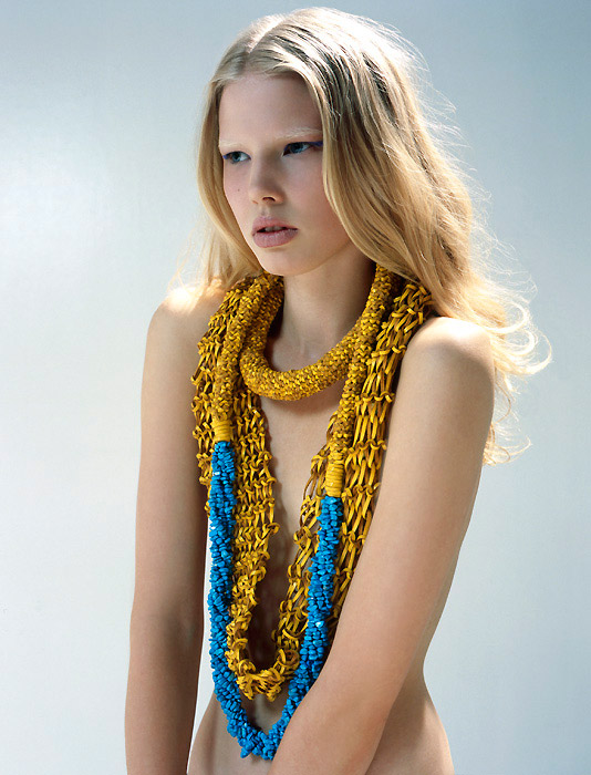 These lovely girls (my "sisters") make wondrous floral necklaces and brooches out of hand-made fabric flowers that have been dipped in coloured resin. Their jewellery was featured on the runway in the RAFW09 Antipodium show (see image below)